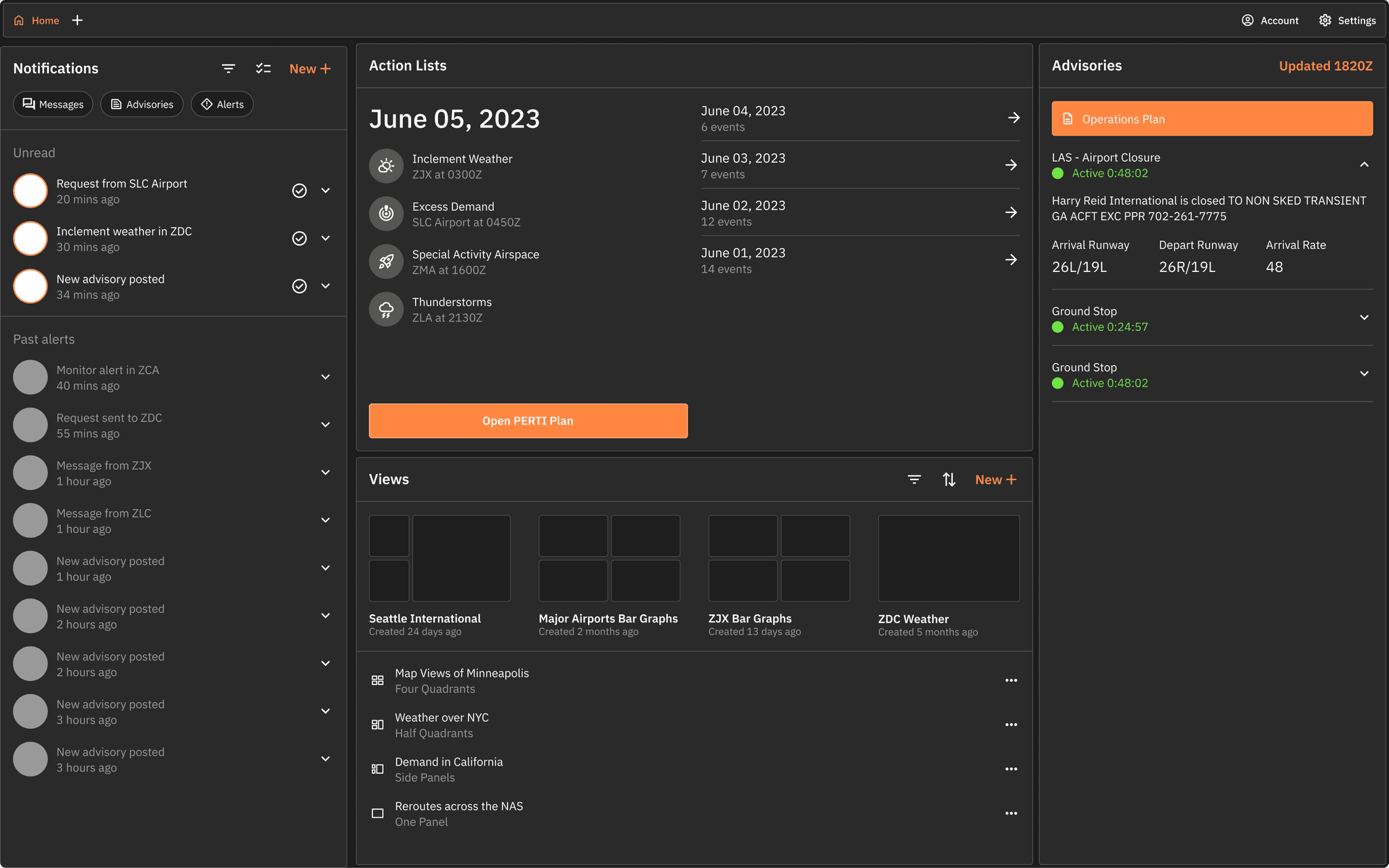 Our redesign solves this by introducing a central home page that acts as the hub for all notifications and tasks. When air traffic controllers log in, the home page displays missed messages from other airports or controllers, updates on current advisories, and a prioritized list of action items. This streamlined approach keeps controllers informed and focused, guiding them to the most urgent tasks right from the start.