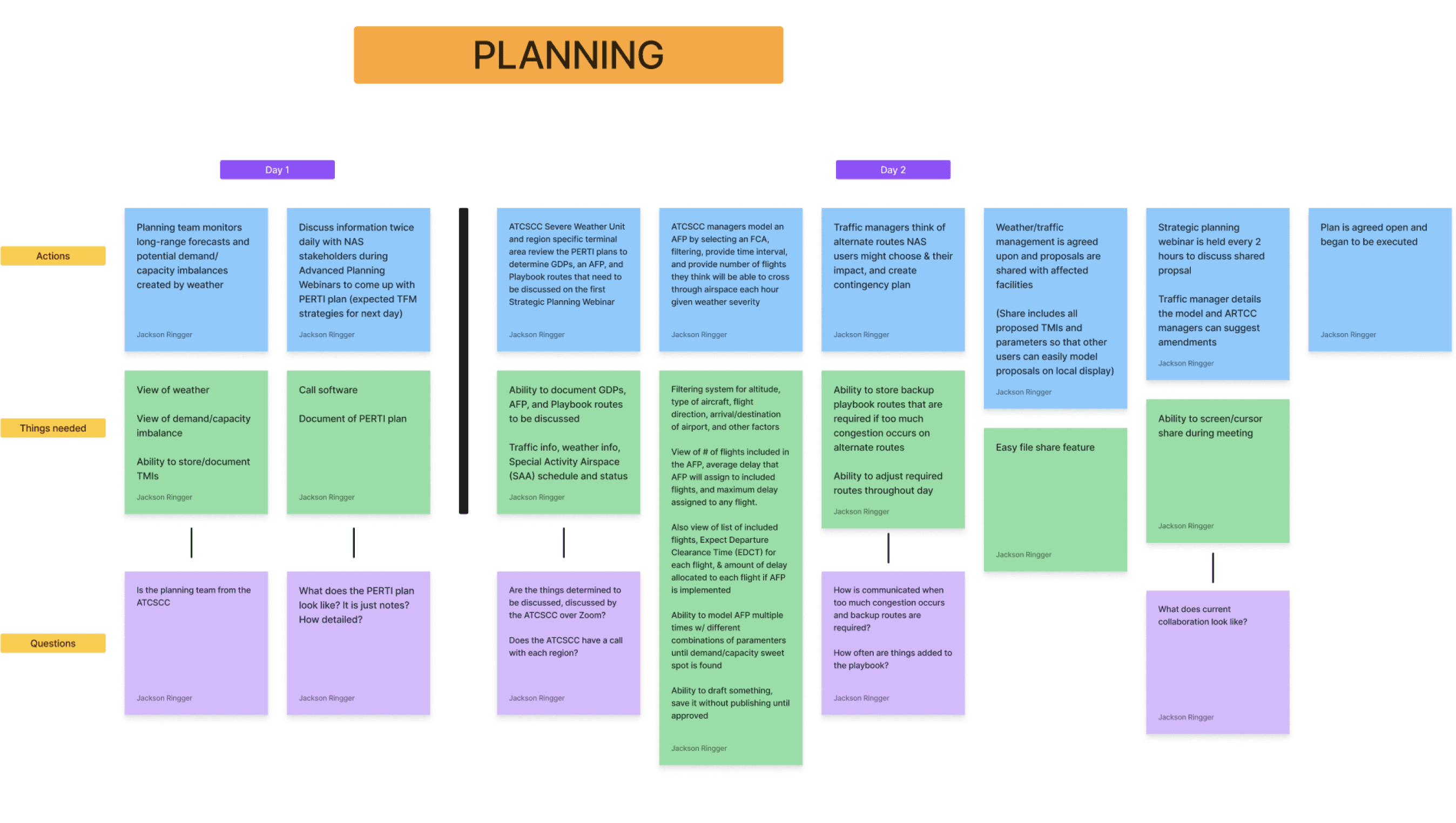 With a solid initial understanding of the air traffic control software, it was time to flow chart and diagram the various air traffic controller user flows we learned about through the provided documentation. We organized the chart, recording each action, the things needed to accomplish that action, and including questions we were unclear about to ask users. This step was crucial in being able to organize step by step the various user tasks and jobs to be done.