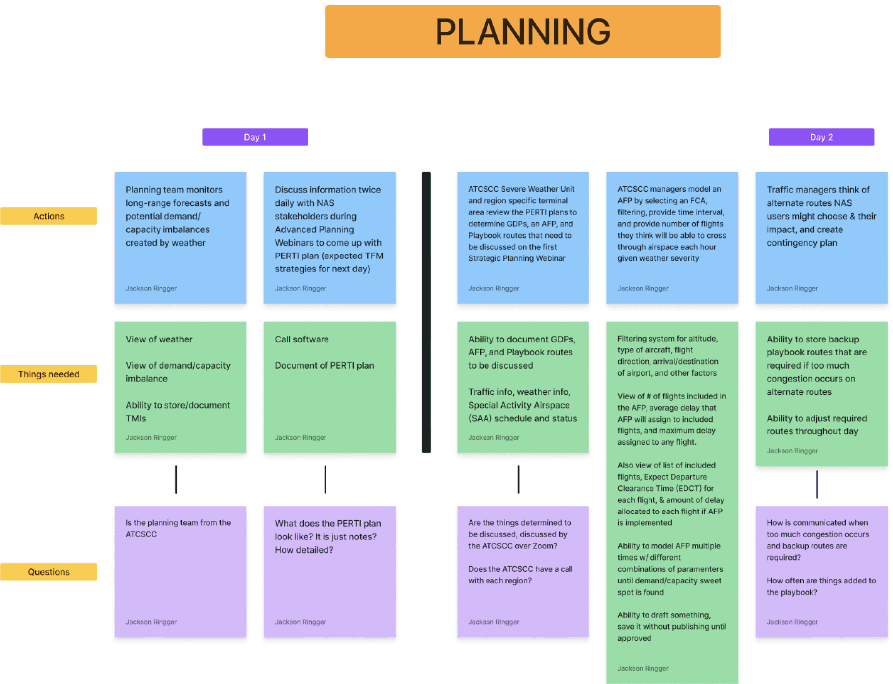With a solid initial understanding of the air traffic control software, it was time to flow chart and diagram the various air traffic controller user flows we learned about through the provided documentation. We organized the chart, recording each action, the things needed to accomplish that action, and including questions we were unclear about to ask users. This step was crucial in being able to organize step by step the various user tasks and jobs to be done.